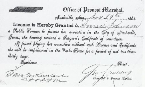 Emaline was not only one of those statistics of Nashville, she was also one of the first such women to get a professional license for vilified vocation when licenses became mandatory in 1863. Pretty Lula Suares, born in Pennsylvania, may have been of Spanish ancestry, and Jinnie Tante may have been French, but the other 205 had such names as Richardson, Scott, Johnson, Fox, Armstrong, Walker, Thomas, Graves, Harris, Patterson, Wilson, Webb, and Martin. The Browns were by far the most prolific, furnishing eight girls to the immodest trade.